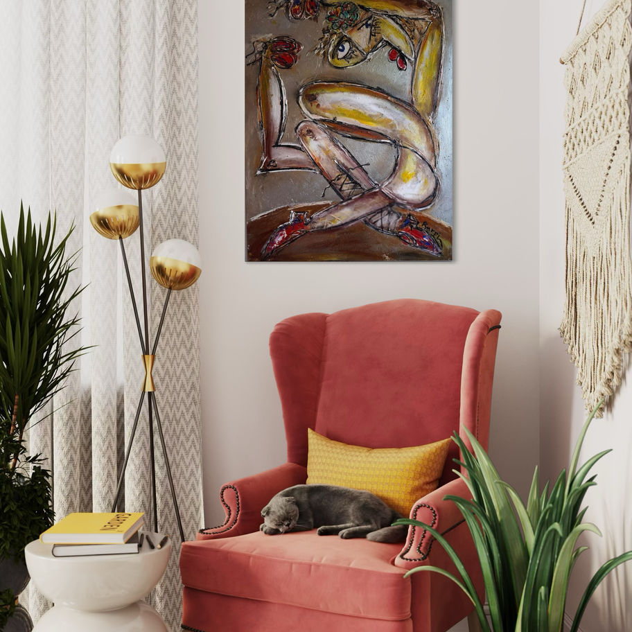 En energifylld och lekfull målning där en figur rör sig i en böljande, danslik pose. De varma guldfärgade nyanserna möter röda detaljer och skapar en känsla av rytm, glädje och liv. Ett verk som fångar både rörelse och fantasi i typisk expressiv Karpi-stil.